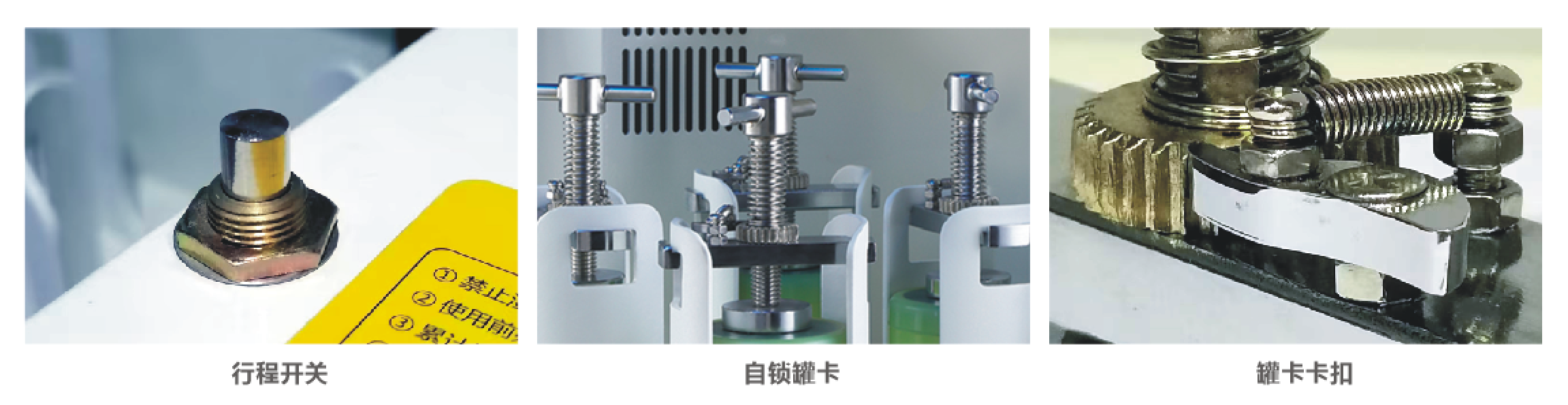 同时自锁罐卡防松动功能(温馨提示:须用随设备附带的加力杆拧紧卡座,并扣上卡扣,轻拨卡扣不弹出即为扣紧)
