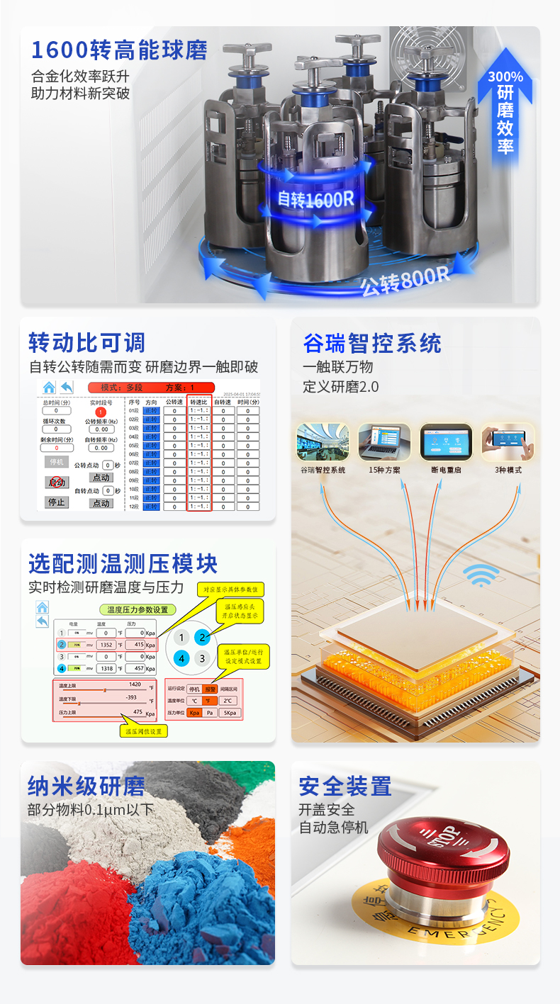 高能球磨机是一款自转速度高达1600转/分的行星式高能球磨机,专门为干磨、湿磨、混合各种粉体物料及金属材料机械合金化而研发。罐体的自转和公转速度可独立调控,罐内产生足够的高能,使颗粒研磨至纳米范围内。适合长时间研磨过程,因此对科研和机械化学有非常大的吸引力。便捷的操作系统、更少的升温效应。