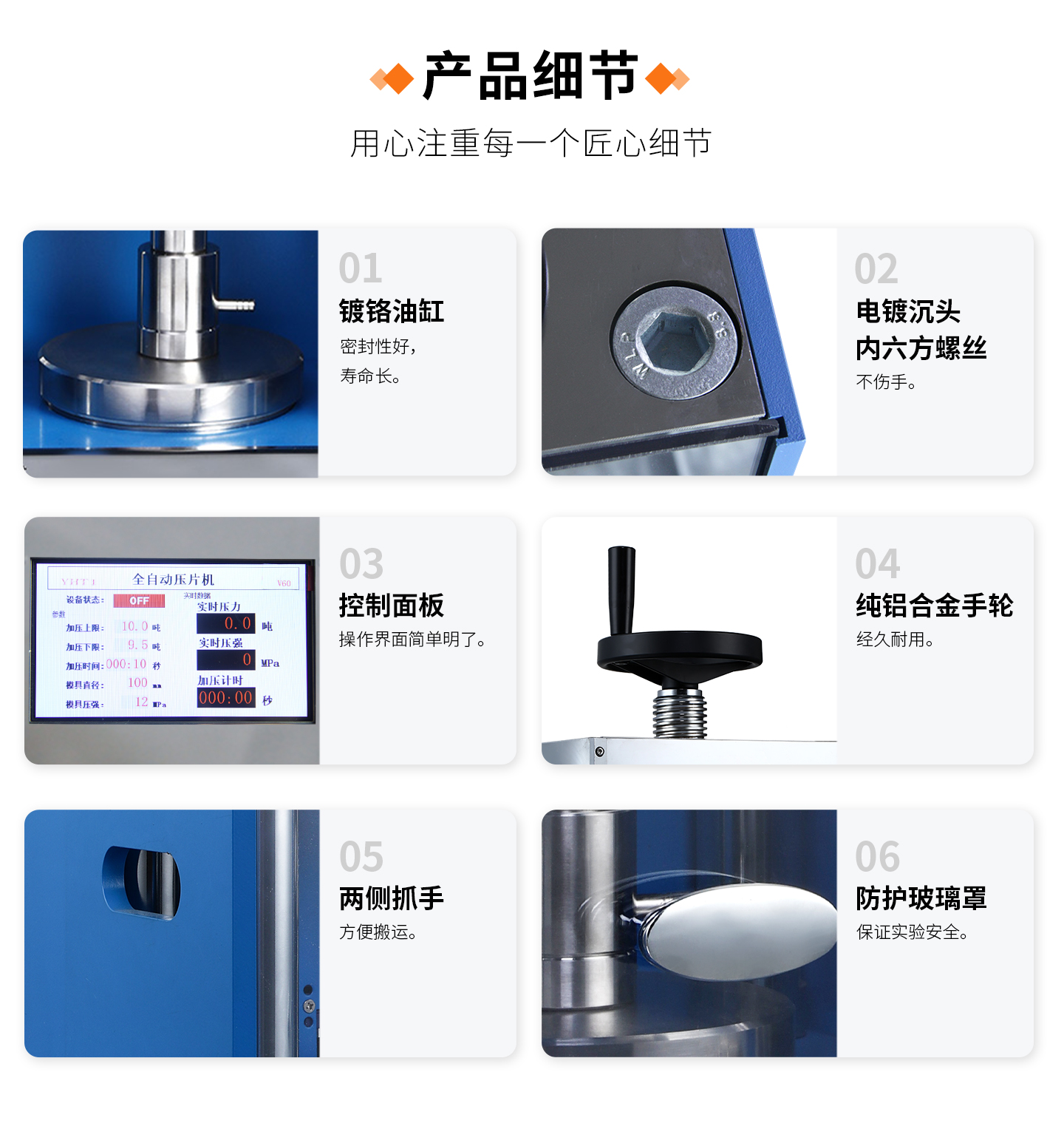 全自动压片机,主要用于3mm-100mm直径以内的样品片压制,多种尺寸的模具配套压片机的机械杠杆原理,既实用又方便,主机全部采用304不锈钢制作及外壳环保喷塑制作,压力显示在真空表显示,是实验科研或小型生产中粉末制备必不可少的一款设备。