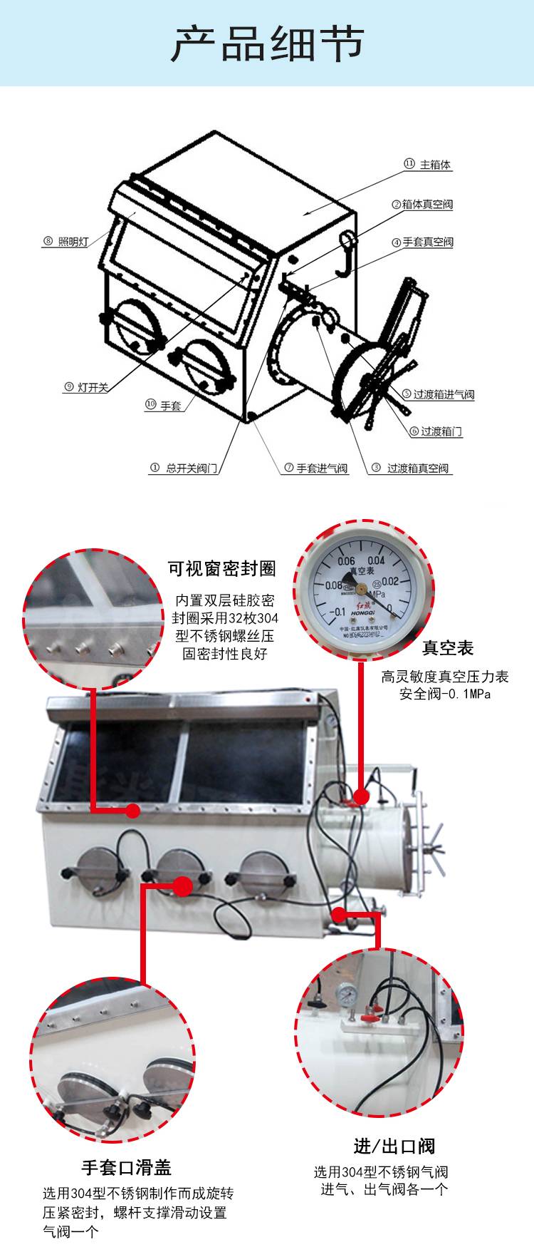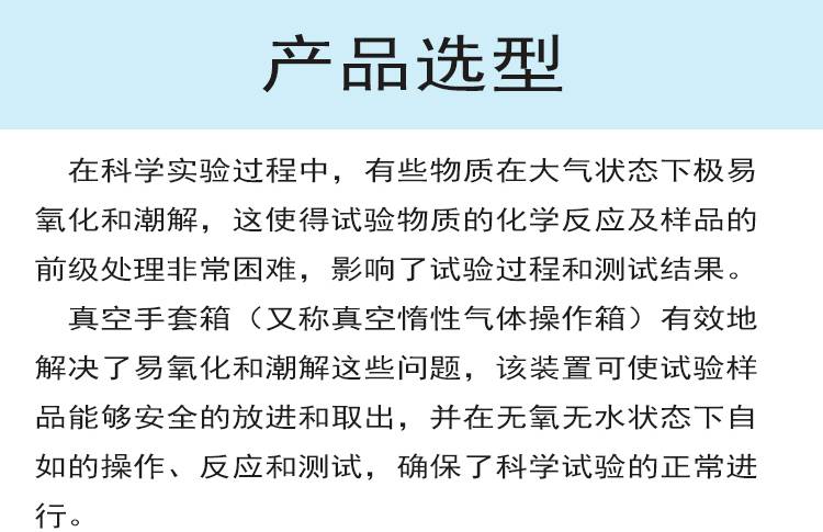 在科学实验过程中,有些物质在大气状态下极易氧化和潮解,这使得试验物质的化学反应及样品的前级处理非常困难,影响了试验过程和测试结果。真空手套箱(又称真空惰性气体操作箱)有效地解决了易氧化和潮解这些问题,该装置可使试验样品能够安全的放进和取出,并在无氧无水状态下自如的操作、反应和测试,确保了科学试验的正常进行。