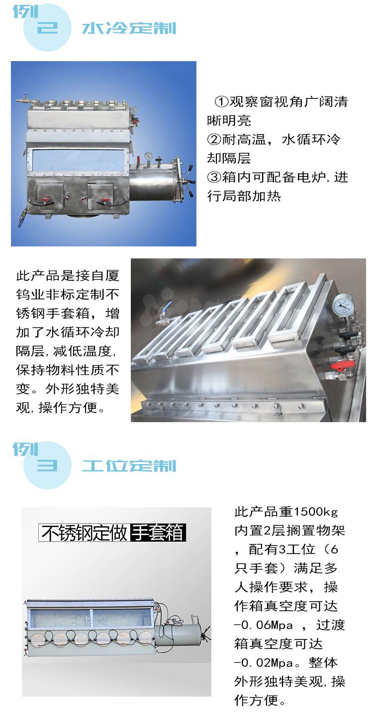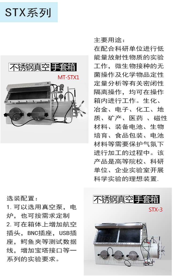 在配合科研单位进行低能量放射性物质的实验工作,微生物接种的无菌操作及化学物品定性定量分析等有关密闭性隔离操作,均可在操作箱内进行工作。生化、冶金、电子、化工、地质、矿产、医药、磁性材料、装备电池、生物培育、食品包装、电池材料等需要保护气氛下进行加工的过程中。该产品是高等院校、科研单位、企业实验室开展科学实验的理想装置。